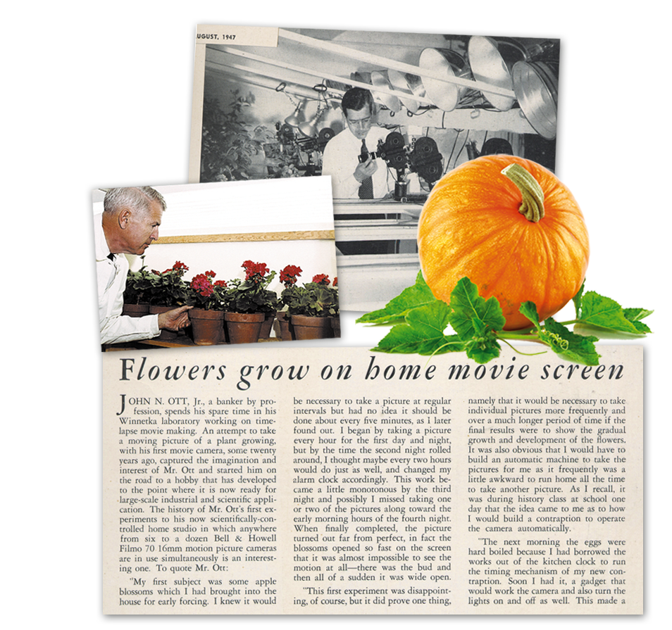 Have you ever seen those Disney movies with all the beautiful flowers opening and dancing – growing from seed to full bloom before your eyes? Then you’ve seen the work of Dr. John Nash Ott. Dr. Ott is known as the father of time lapse photography. In fact, he was asked by the Walt Disney Company to film the entire growth of a pumpkin for Disney animators to draw the transformation of Cinderella’s pumpkin into a carriage.