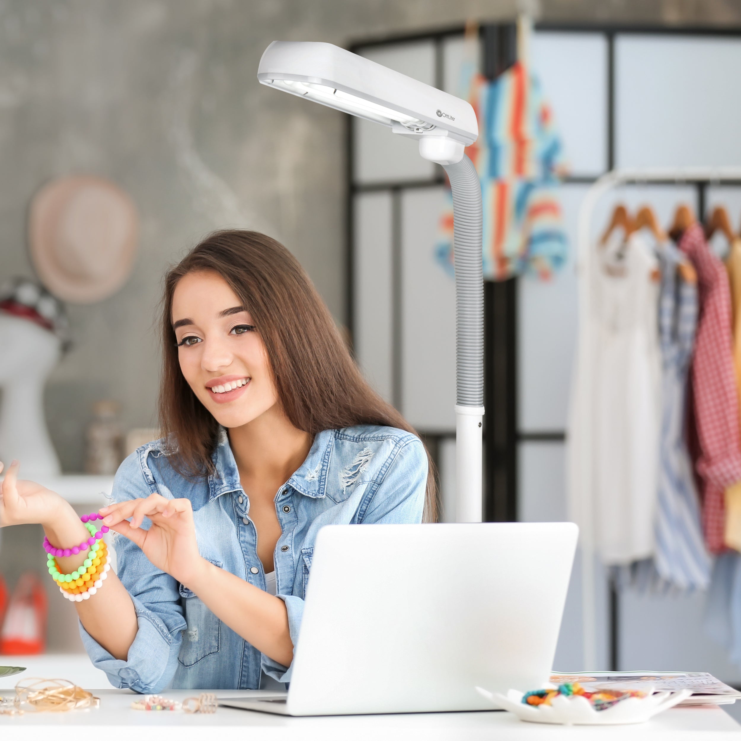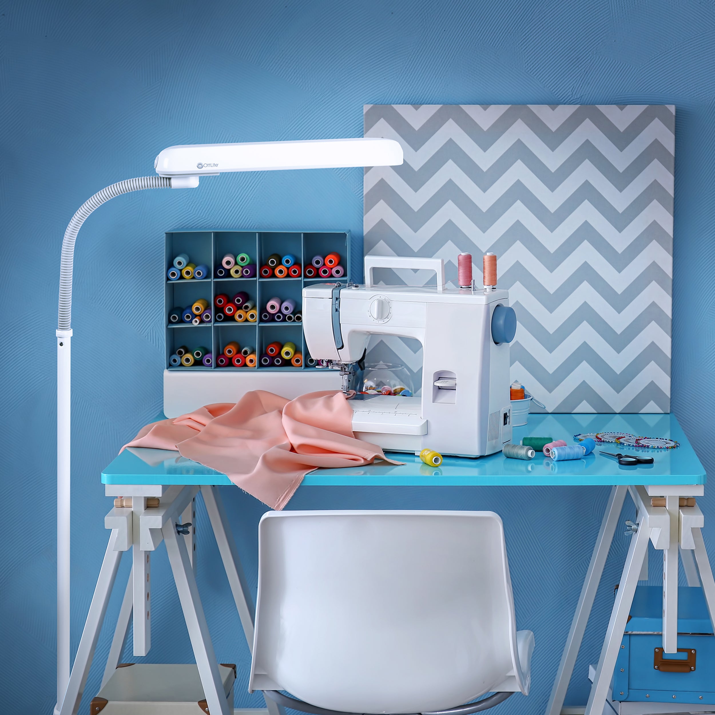 Illuminate large workspaces with the powerful and versatile 24w Extended Reach Floor Lamp. Perfect next to your worktable, chair or sewing machine, this lamp features a wide shade, sturdy yet lightweight base, and an adjustable flex neck to position the wide area illumination where you need it. OttLite allows you to see details clearly and colors accurately, helping you do what you love, longer.